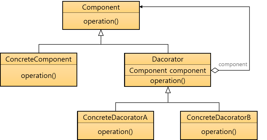 - Component : ConcreteComponent μ Decorator κ° κ΅¬νν μΈν°νμ΄μ€