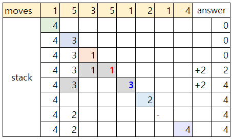 Stack 이 공백이 아니면서, board[i][moves-1] 의 값과 현재 Stack 의 peek() 가장 위의 값이 동일하다.