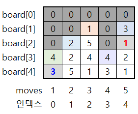 정리하면, board[ i ][moves - 1] 으로 i 를 1 씩 증가시키며 확인한다.