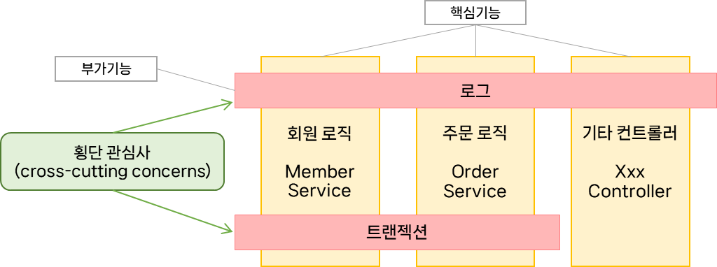 보통 부가기능은 여러 곳에서 공통으로 사용되는 경우가 많다. 예를들어 모든 호출에서 로그를 남기는 경우, 보안을 강화하는 로직을 이용하는 경우 등이 있다. 이러한 부가 기능은 횡단 관심사 (cross-cutting concerns) 라고 한다.