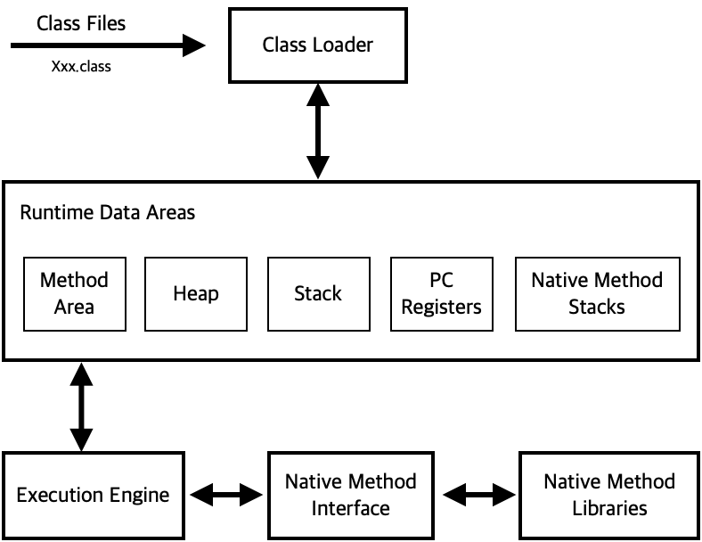 - 로드된 클래스 파일 (Xxx.class) 들은 기계가 읽을 수 없으므로 실행 엔진 (Execution Engine) 을 통해 기계어로 변환하여 실행한다.