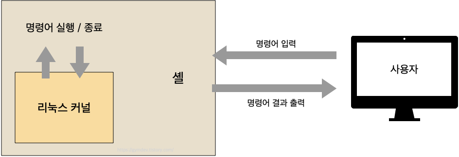 이 과정에서 (3) 명령어를 실행하는 과정은 리눅스의 본체인 커널이 수행한다. 커널은 운영체제 중심에서 CPU나 메모리 등의 하드웨어를 관리하면서 명령어를 실행하고 프로세스를 관리한다. 리눅스에서는 사용자가 커널을 직접 조작하는 것이 아니라 사이에서 명령어를 조작해주는 소프트웨어가 필요하다. 이 소프트웨어가 셸이다. 즉, 셸(Shell) 이란 커널의 인터페이스에 해당한다.