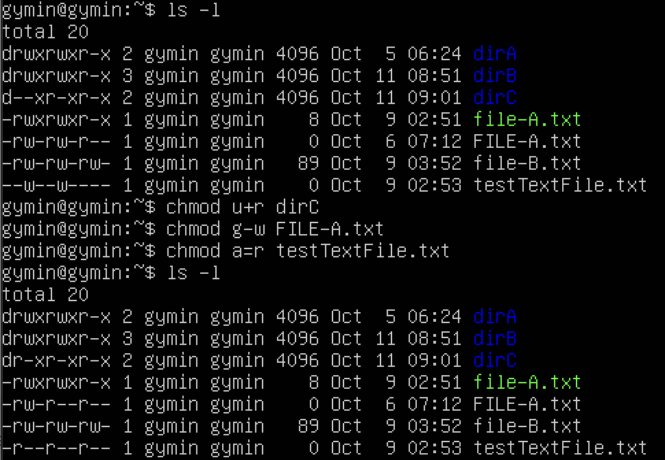- 디렉토리 dirC 에 소유자(u)권한으로 읽기(r) 추가