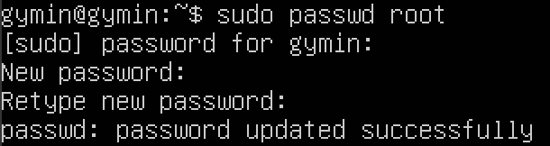 【참고】 우분투 (ubuntu) 의 경우, 처음에는 슈퍼 사용자의 패스워드가 설정되어 있지 않아 바로 su 명령어로 슈퍼사용자로 전환할 수 없다. 따라서 다음과 같이 슈퍼사용자의 패스워드를 설정해야 한다.