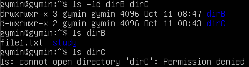읽기 권한(r) 이 없는 디렉토리 dirC 의 파일목록을 확인하기위해 ls 명령어를 실행하면 다음과 같은 메시지가 출력되며 실패한다.