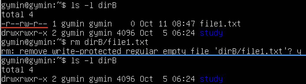 디렉토리에 쓰기 권한(w)이 있으면 해당 디렉토리 밑에 파일을 작성하거나 삭제할 수 있다. 쓰기 권한이있는 디렉토리 dirB 아래에 있는 파일 중에 쓰기 권한(w)이 없는 파일 file1.txt 를 삭제하기위해 다음과 같이 rm 명령어를 실행하면 다음과 같은 메시지가 출력된다.