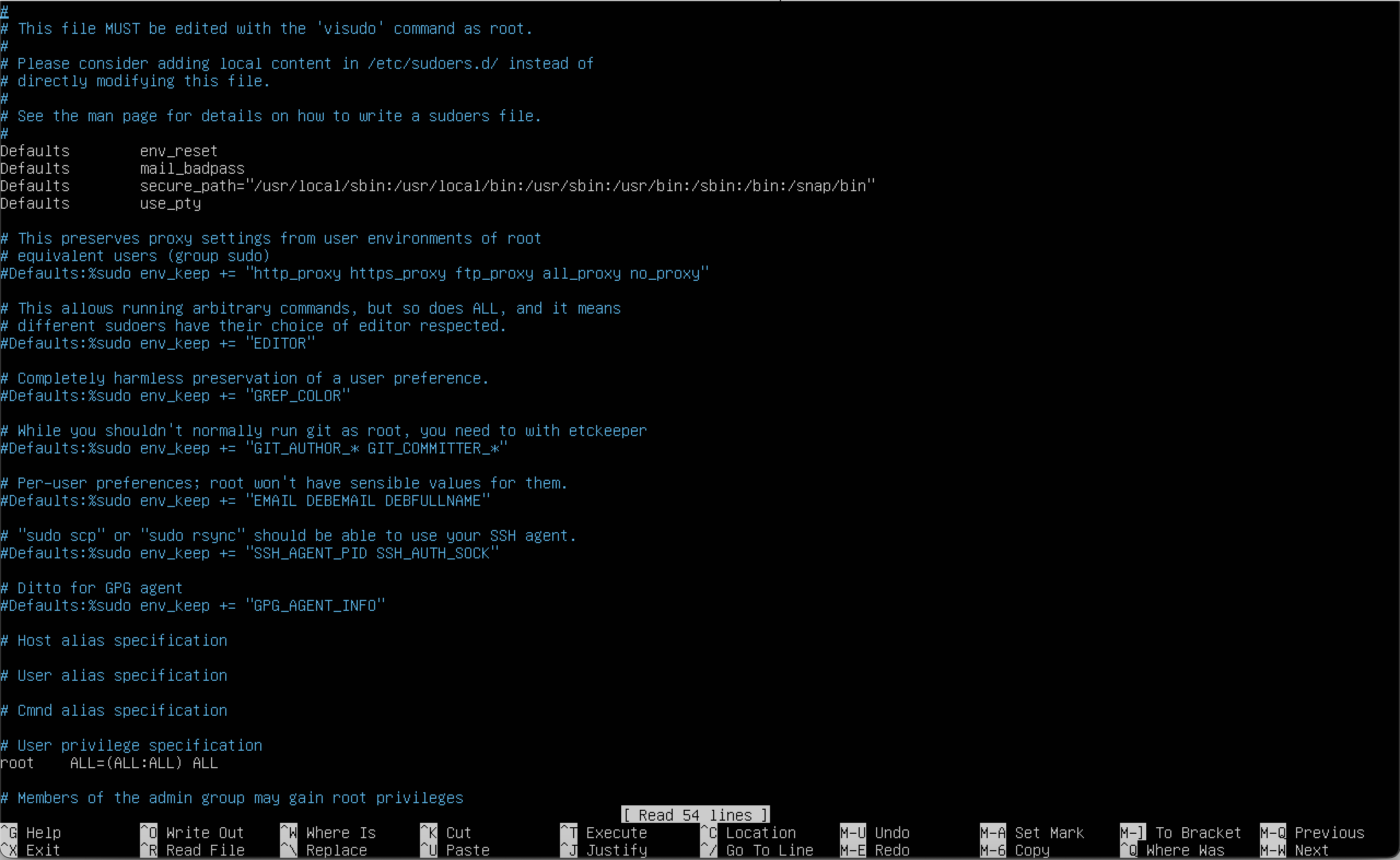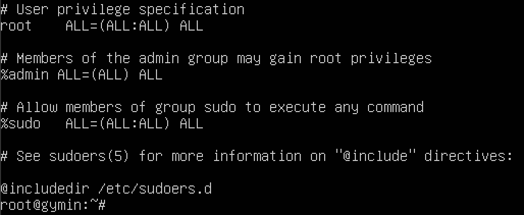 sudo 그룹(관리자)에 속한 사용자는 모든 머신에서 모든 명령어를 실행할 수 있다는 의미이다. 따라서 특정 사용자에게 권한을 부여하려면 슈퍼사용자가 다음과 같이 파일에 지정하면 된다.
