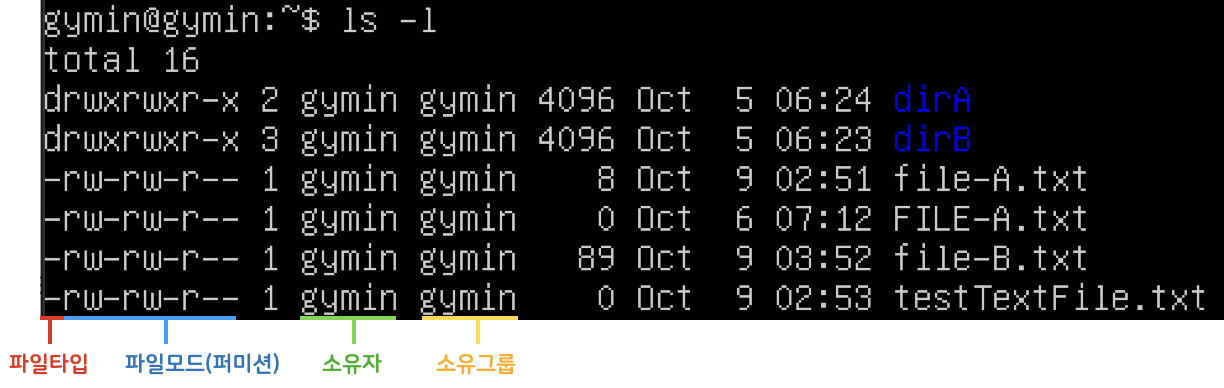 앞에 10글자가 출력되는데 첫 1글자는 파일타입을 의미하며, 뒤 9글자는 파일모드(퍼미션)을 의미한다.