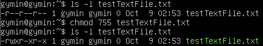 다음의 명령어를 실행하여 r--r--r-- 의 퍼미션이 rwxr-xr-x 으로 변경된 것을 확인할 수 있다.