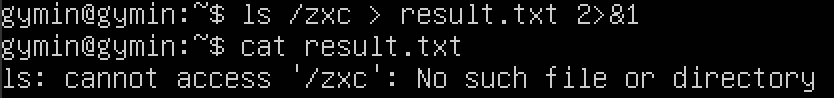 표준 출력과 표준 에러 출력을 파일 하나에 리다이렉션 할 수도 있다. 표준 출력을 리다이렉션한 뒤에 2>&1 을 붙여주면 된다.