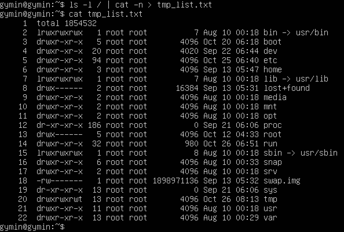 다음과 같이 파이프로 연결하여 ls 명령어의 결과에 cat -n 으로 행 번호를 부여하여 그 결과를 tmp_list.txt 파일로 출력할 수 있다.