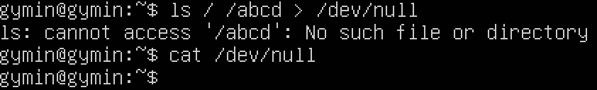 표준 출력을 /dev/null 로 리다이렉션하면 콘솔에도, 파일에도 아무것도 출력되지않는다. 이 특징을 이용하여 유용하게 사용할 수 있다. 예를 들어, 표준 출력으로 출력되는 내용이 너무 많거나 표준 에러 출력만 확인하고 싶을때 이용하는 방법이다.