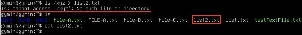 $ ls /abcde > list2.txt 2> error.txt # /abcde 는 임의의 디렉토리로 존재하지 않는 디렉토리이다