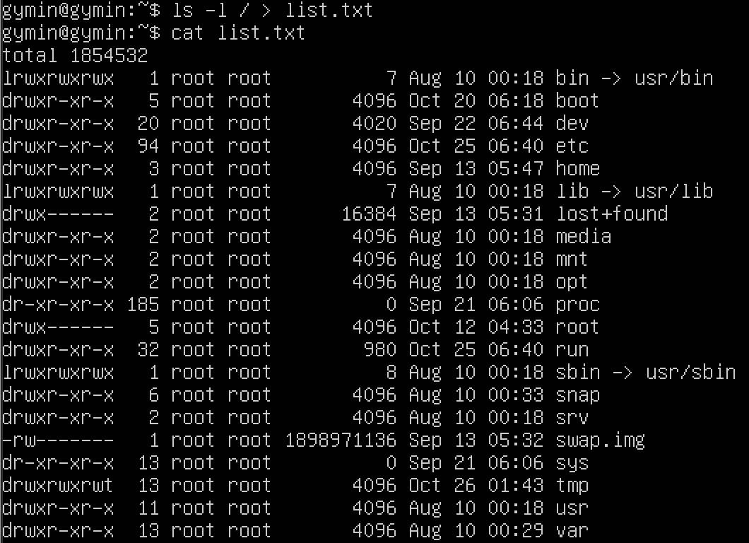 표준 출력도 리다이렉션 할 수 있으며 기호는 > 이다. 명령어의 실행 결과를 화면에 출력하는 것이 아니라 파일에 저장하는 방식으로 많이 사용된다.