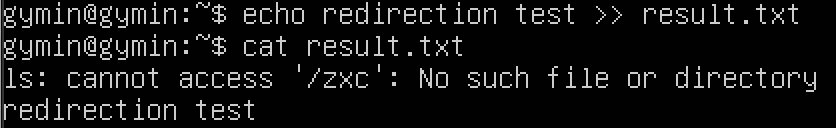 표준 출력을 파일에 리다이렉션해도 에러메시지는 출력되며, 출력결과 파일도 생성되는 것을 확인할 수 있다. 이는 표준 출력과 에러 출력이 별도의 채널을 사용하기 때문이다.