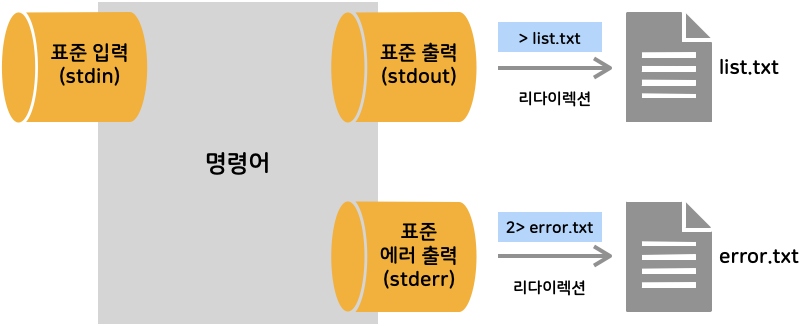 다음과 같이 명령어를 실행하면 ls 명령어의 실행결과는 list2.txt 에 출력 및 저장되며 에러 메시지는 error.txt 에 출력 및 저장된다.