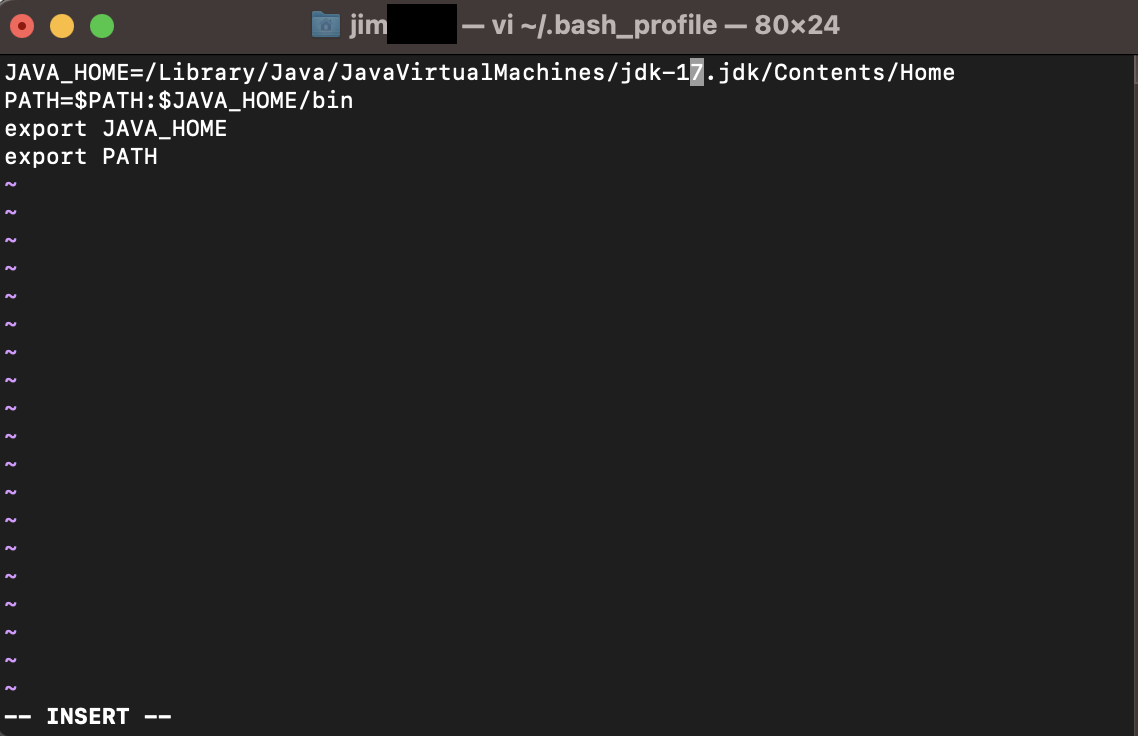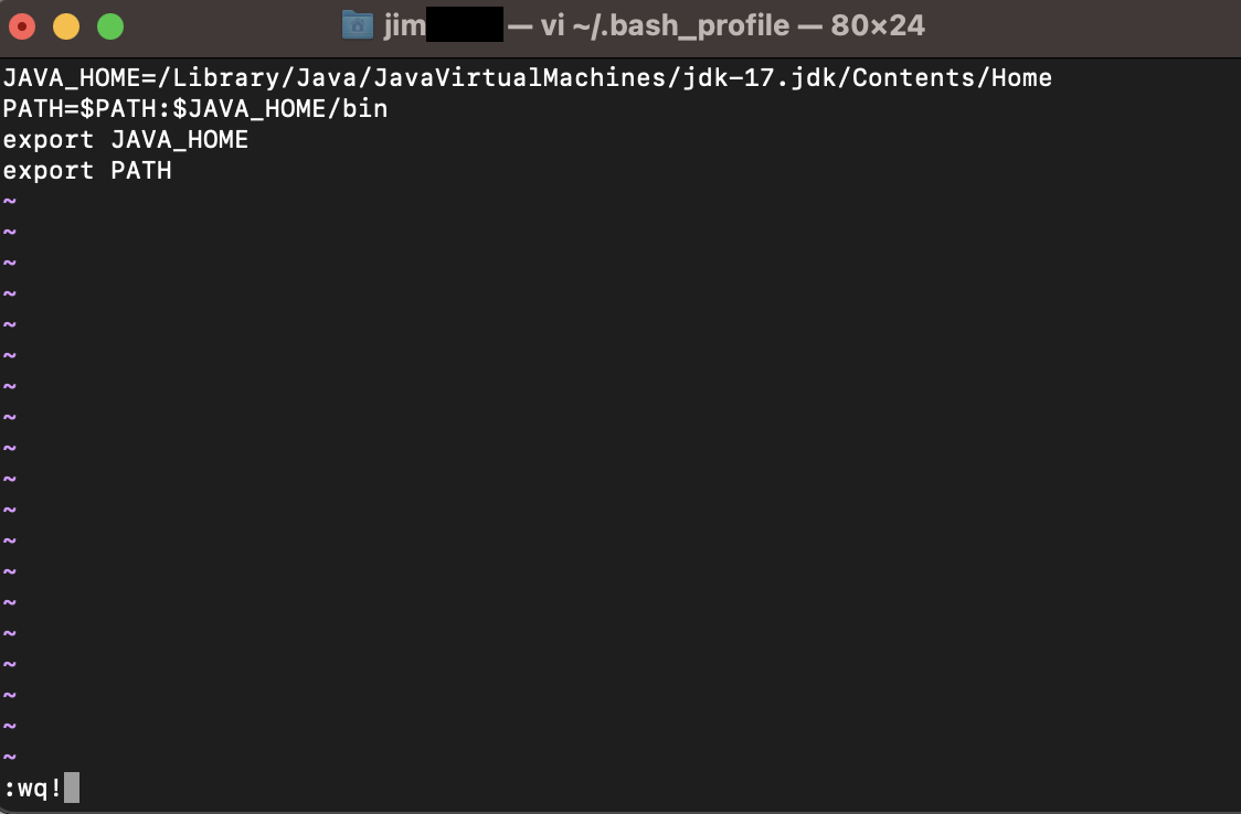 복사한 경로를 .bash_profile 에 붙여넣어 JAVA 경로를 설정한다.