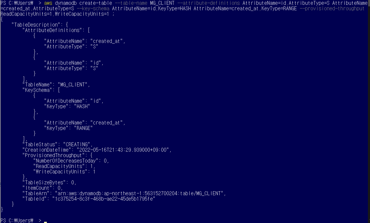 - 【참고】 : https://docs.aws.amazon.com/ko_kr/cli/latest/userguide/cli-services-dynamodb.html