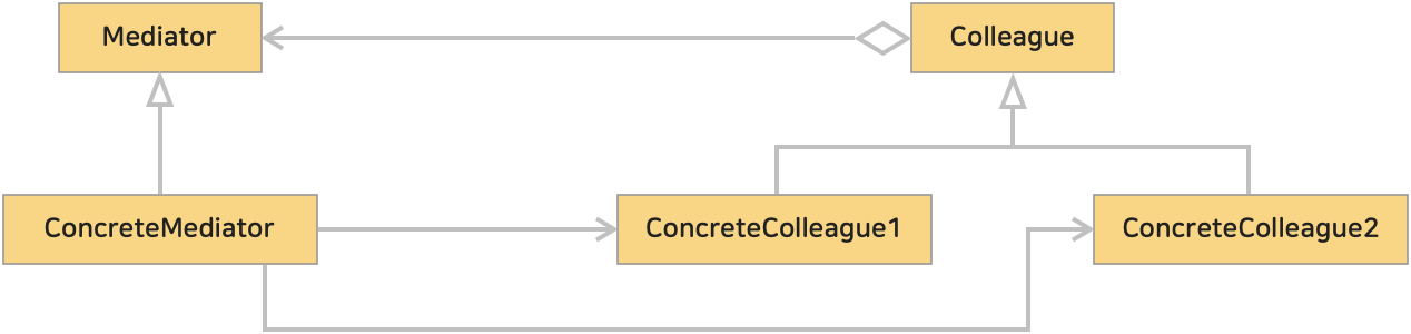 - Colleague 는 서로 직접 통신하지 않고 Mediator(중재자)를 통해 간접적으로 통신
