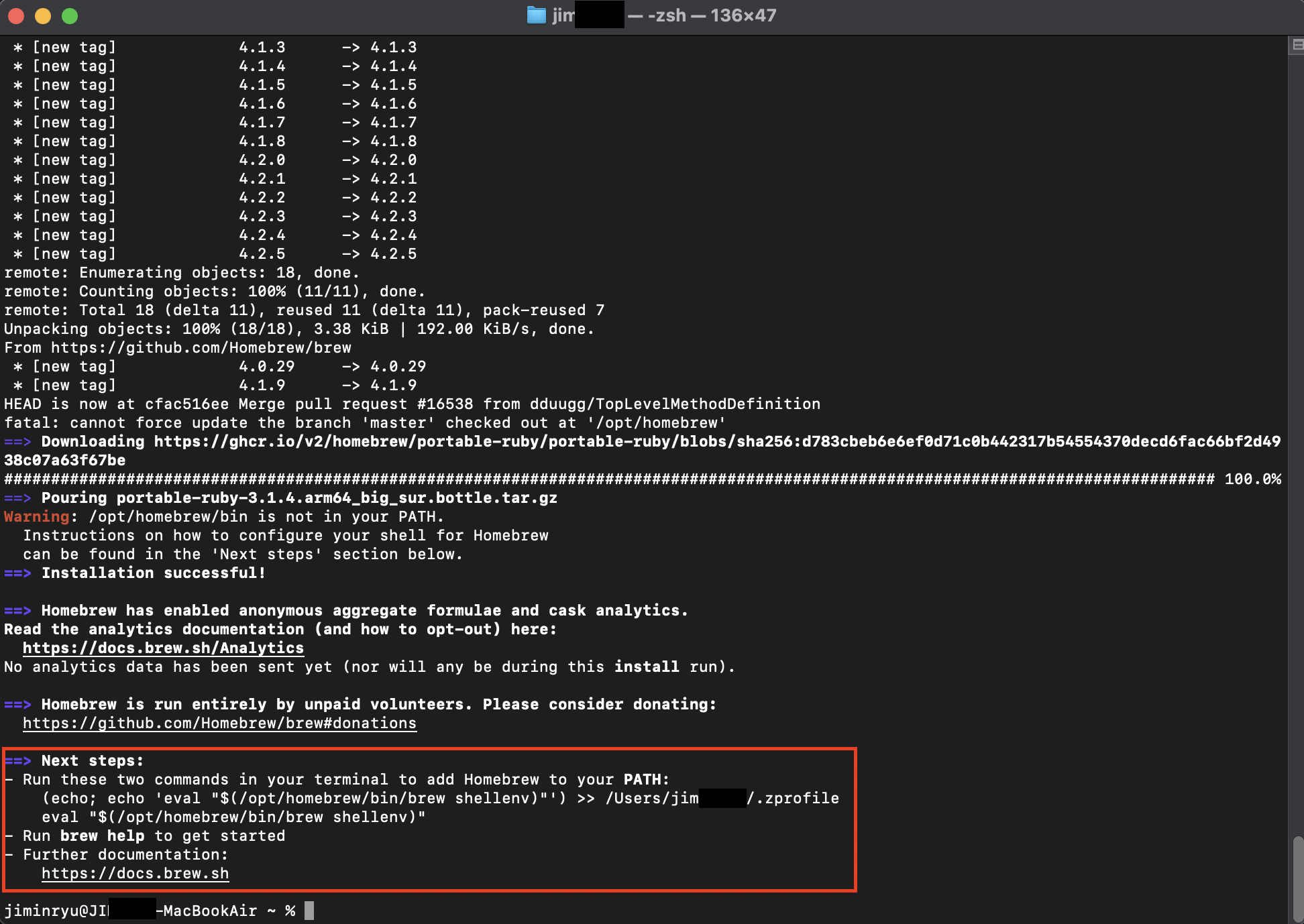 ==> /usr/bin/sudo /usr/sbin/chown -R jiminryu:admin /opt/homebrew