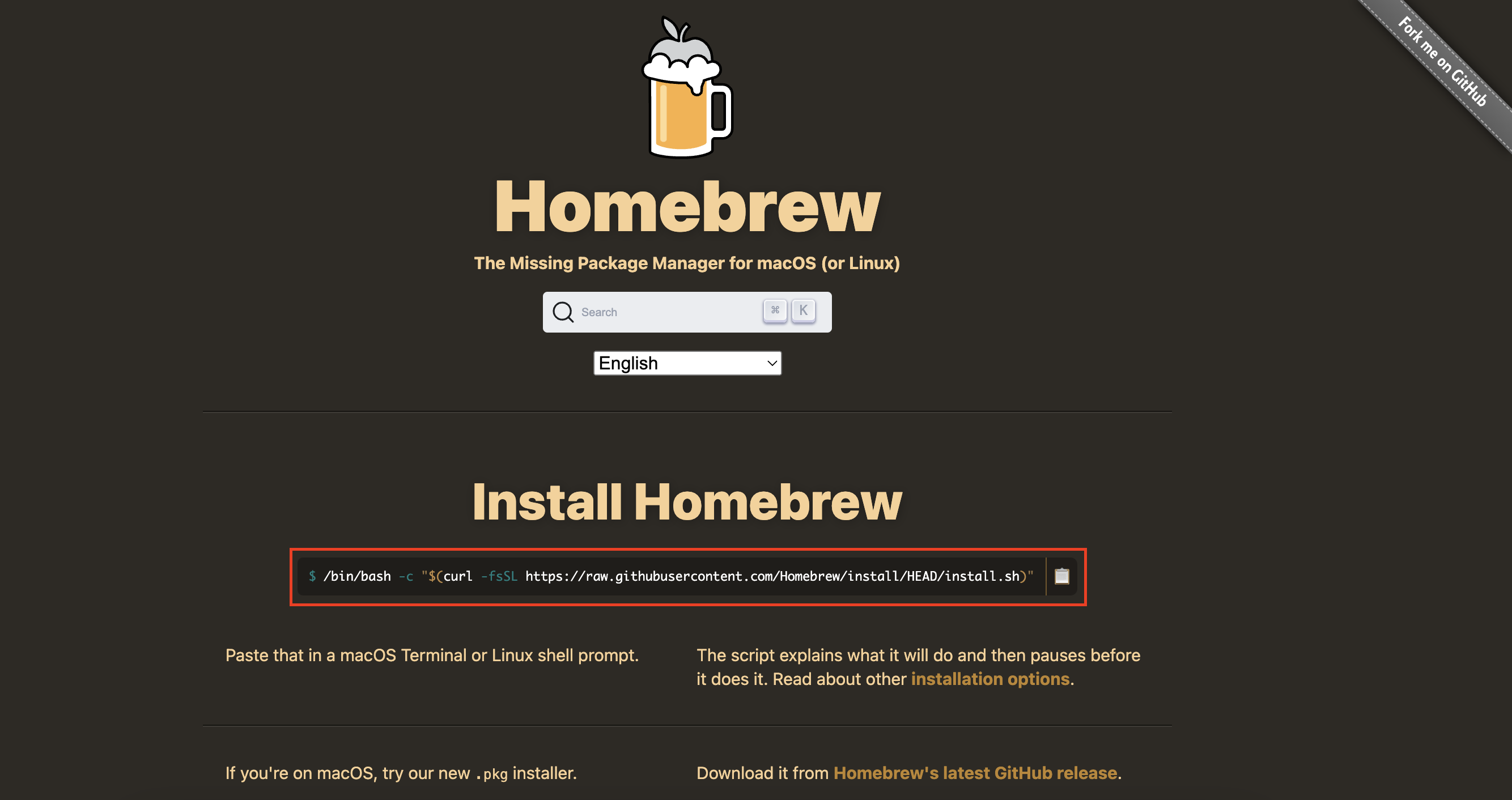 홈브류 ( https://brew.sh/ ) 에 접속하여 설치하기위한 명령어를 복사한다.